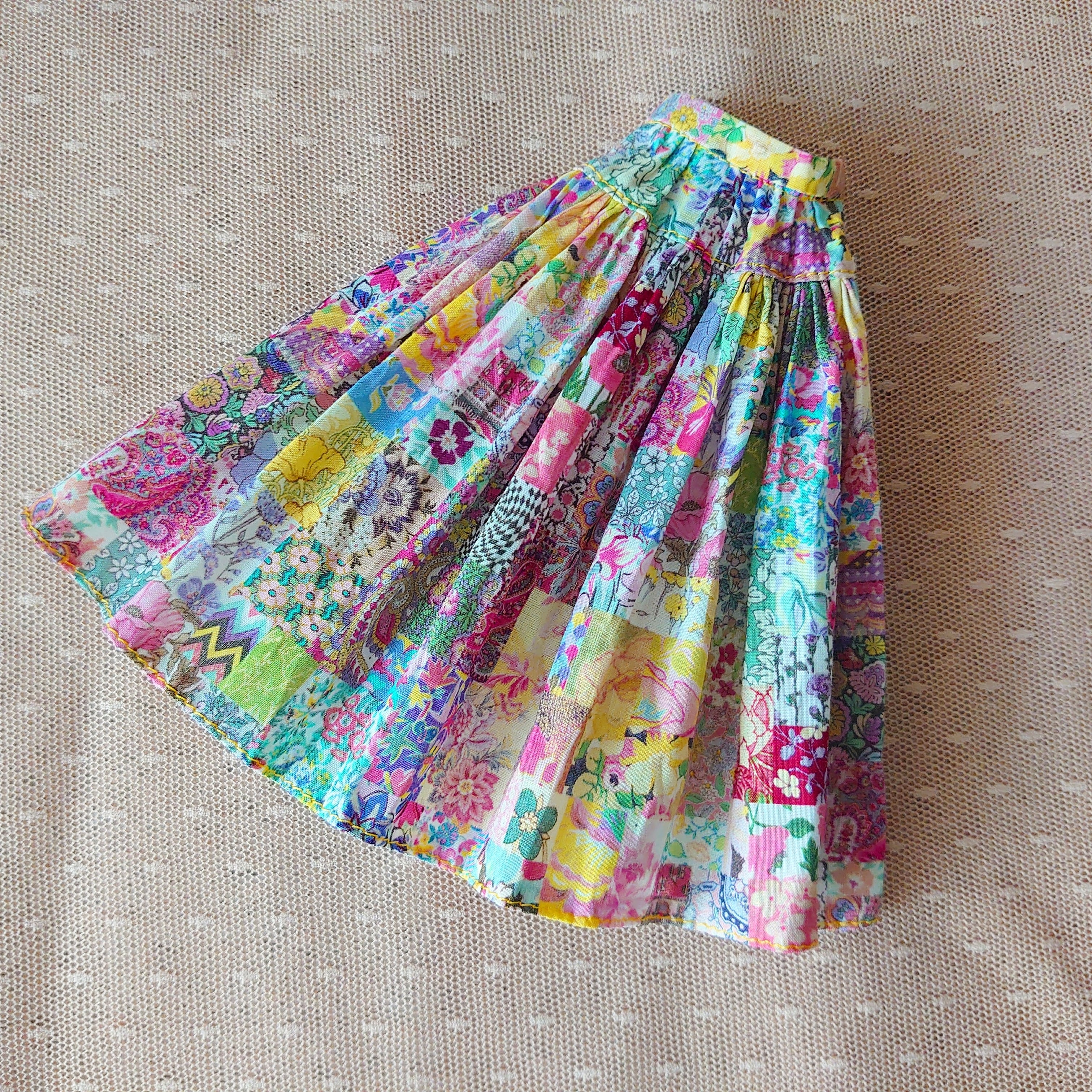 スカートはリバティの生地「アーカイブパッチワーク」を使用しています
