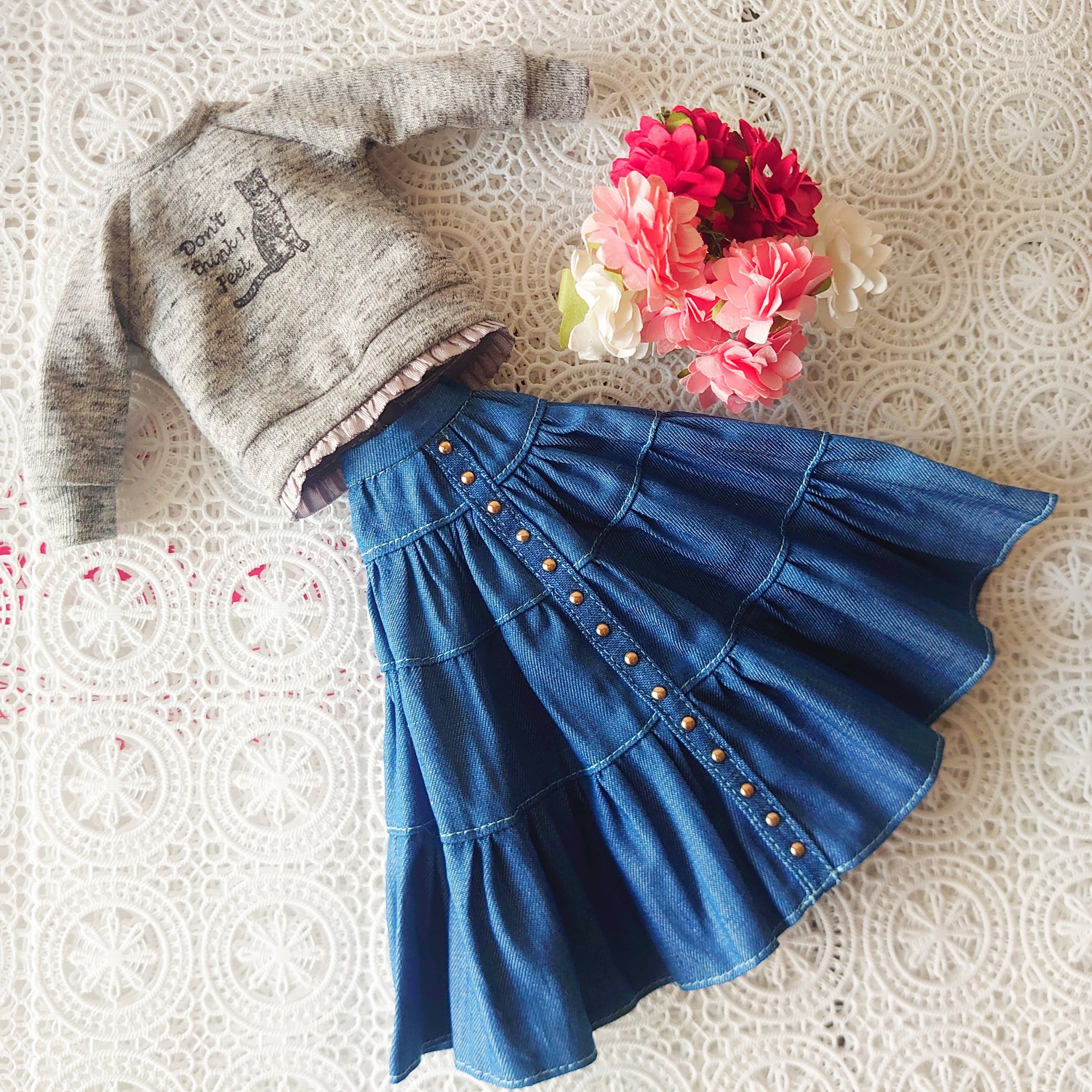 27cmドールサイズのトレーナー、4段ティアードデニムスカートの2点セットです